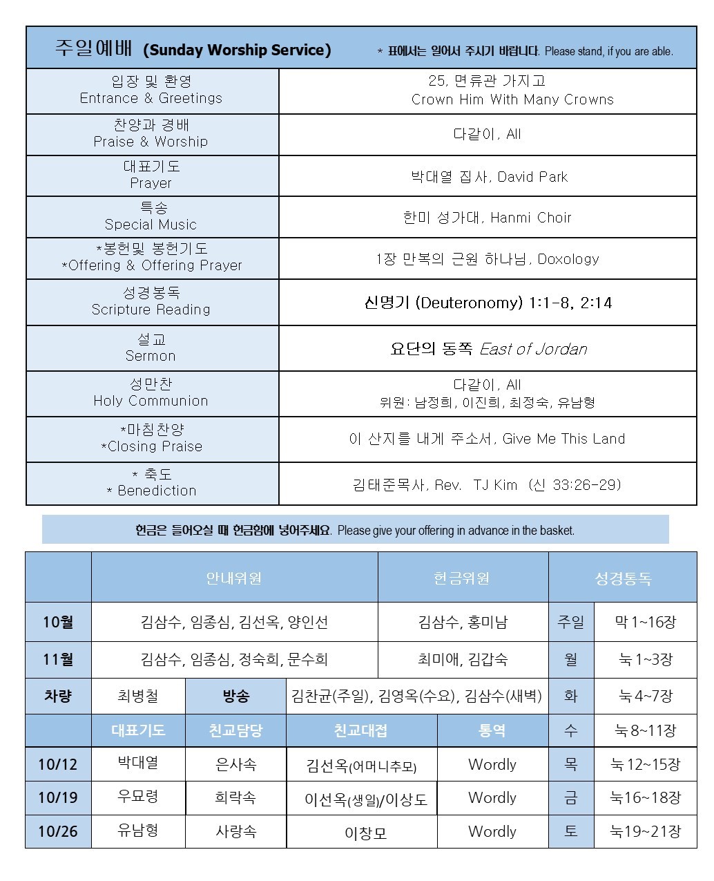 * 지하 친교실 공사가 10월 20일부터 두주간 있겠습니다. 공사로 인하여 10월 26일과 11월 2일 친교는 없겠습니다