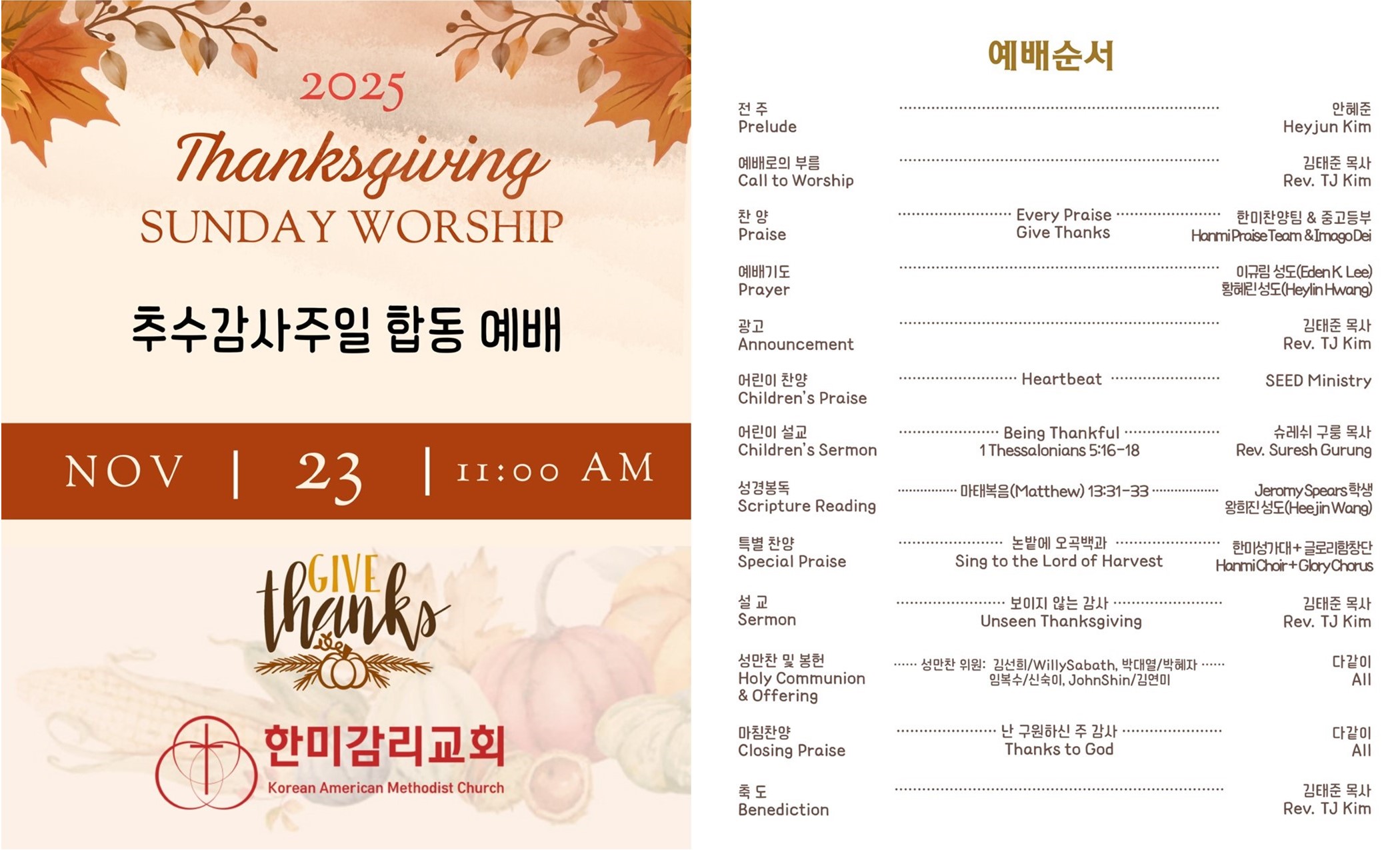 2025 Thanksgiving Sunday 11/23/2025 페이지 정보 작성자 한미감리교회 조회 175회 작성일 25-11-23 08:11 목록 본문 2025 Thanksgiving Sunday 11/23/2025 댓글 0 댓글목록 등록된 댓글이 없습니다. 목록