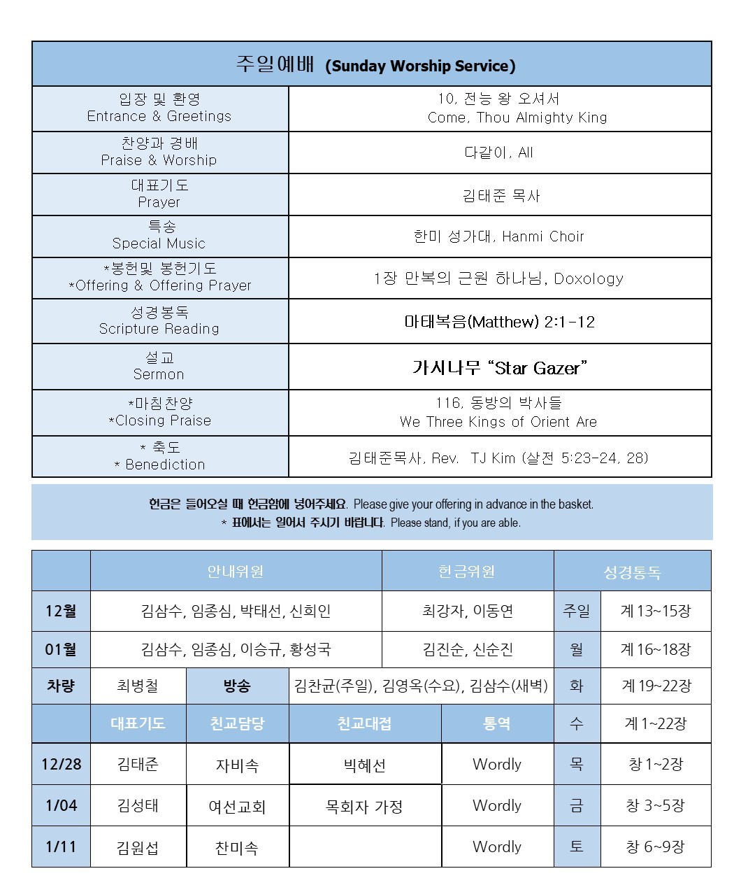 * 지난 성탄절 이브 찬양제를 위해서 수고해 주신 모든 출연자 여러분께 감사를 드립니다. 또한 출연진을 위해서 저녁식사를 준비해 주신 친교부 이하 여러분께 감사를 드립니다