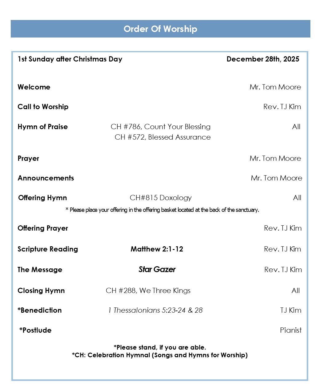 12/28/2025 - [EM] Announcement 페이지 정보 작성자 한미감리교회 조회 76회 작성일 25-12-27 14:47 목록 본문 Enlarge * Welcome to the last Sunday’s Service of 2025. As we reflect on God’s grace that has sustained us throughout the year, we pray that the grace of God, who holds all time in His hands, will overflow in your life through today’s worship. * Bagels and coffee are available in the Fellowship hall downstairs after the service. * Sunday School Class will meet after the service in the Young Adults’ Room. * Monthly Bible Study meets at 8:00 am, every second Saturday of month. Next month we are studying the Chapter 5, First Letter of Peter, on January 10, led by Elder Mr. Steven Gras. Everyone is invited. * We also extend our gratitude to the Education Department and PTA for organizing the Imago Dei Ski Trip held last Monday, and especially to Mr. Thomas Vita for providing transportation for the students. * Our heartfelt thanks go to PTA President Yunmi Shin and the rest of the PTA members who served at the SEED Children’s Ministry and Imago Dei Youth Family Night last Friday. About 70 people attended! * The New Year’s Eve Service will be held on Wednesday, December 31, at 11:00 PM. Let us close the year with gratitude and welcome the new year with new hope and renewed faith. * Special Prayers of Blessing will be offered before the New Year’s Eve Service, starting at 10:00 PM, Wednesday. Please sign up on the sheet posted in the sanctuary and come at your selected time. * Please submit your prayer requests for the new year with the “2026 Prayer Requests” form. Please place it in the offering box or bring it to the church office. * On Sunday, January 4, we will have a New Year’s Tteokguk (rice cake soup) fellowship hosted by the pastoral families, along with a friendly Yut-nori game between small groups. Let us usher in and celebrate the new year with joy and gladness. * The New Year’s Special Early Morning Prayer Services of Blessing will be held every Saturday in January: Jan 3- Blessing for Youth & Children, 10- Blessing for EM Congregation, 17- Blessing for Men’s Ministry & 24- Blessing for Women’s Ministry. * Congratulations to the newly elected presidents for the Women’s Missions: Myong Anderson (Hannah), Young-ok Cummins (Lydia), Chong Clay (Esther), Myung-hee Lee (Martha). * Congratulations to newly elected SPRC Chair Sina Smith and Secretary Nam Seo. * The Board of Trustees meeting will be held today at 1:00 PM in the Youth Room. And PTA will meet today at 12:40 in the sanctuary. * Church Council will meet on January 11th. 댓글 0 댓글목록 등록된 댓글이 없습니다. 목록