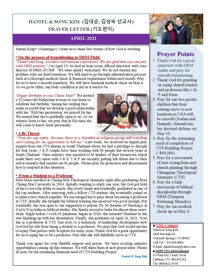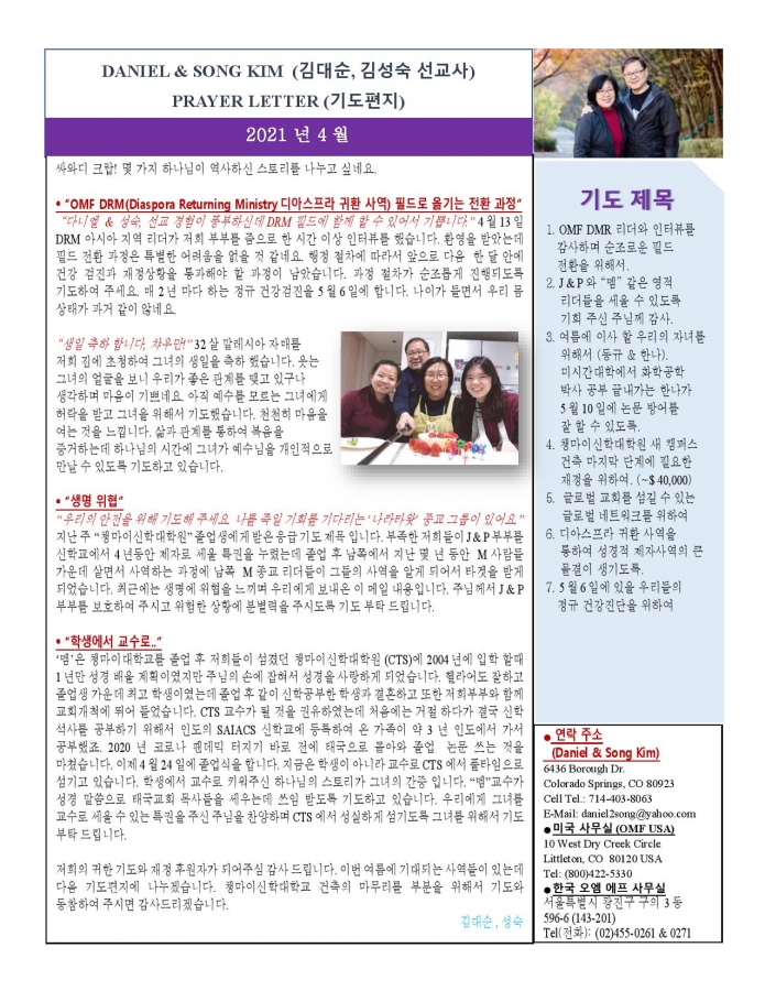2021년 4월 태국에서 온 선교편지 페이지 정보 작성자 한미연합감리교회 조회 1,293회 작성일 21-04-24 11:55 목록 본문 2021년 4월 태국에서 온 선교편지 이전글2021 태국에서 온 선교편지 5월&6월 21.05.30 다음글2021년 나바호인디언 21.04.12 댓글 0 댓글목록 등록된 댓글이 없습니다. 목록