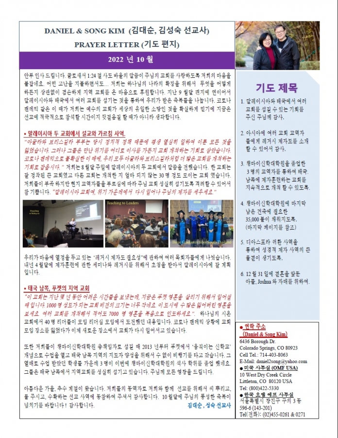 2022년 10월 말레이시아와 태국에서 온 선교편지