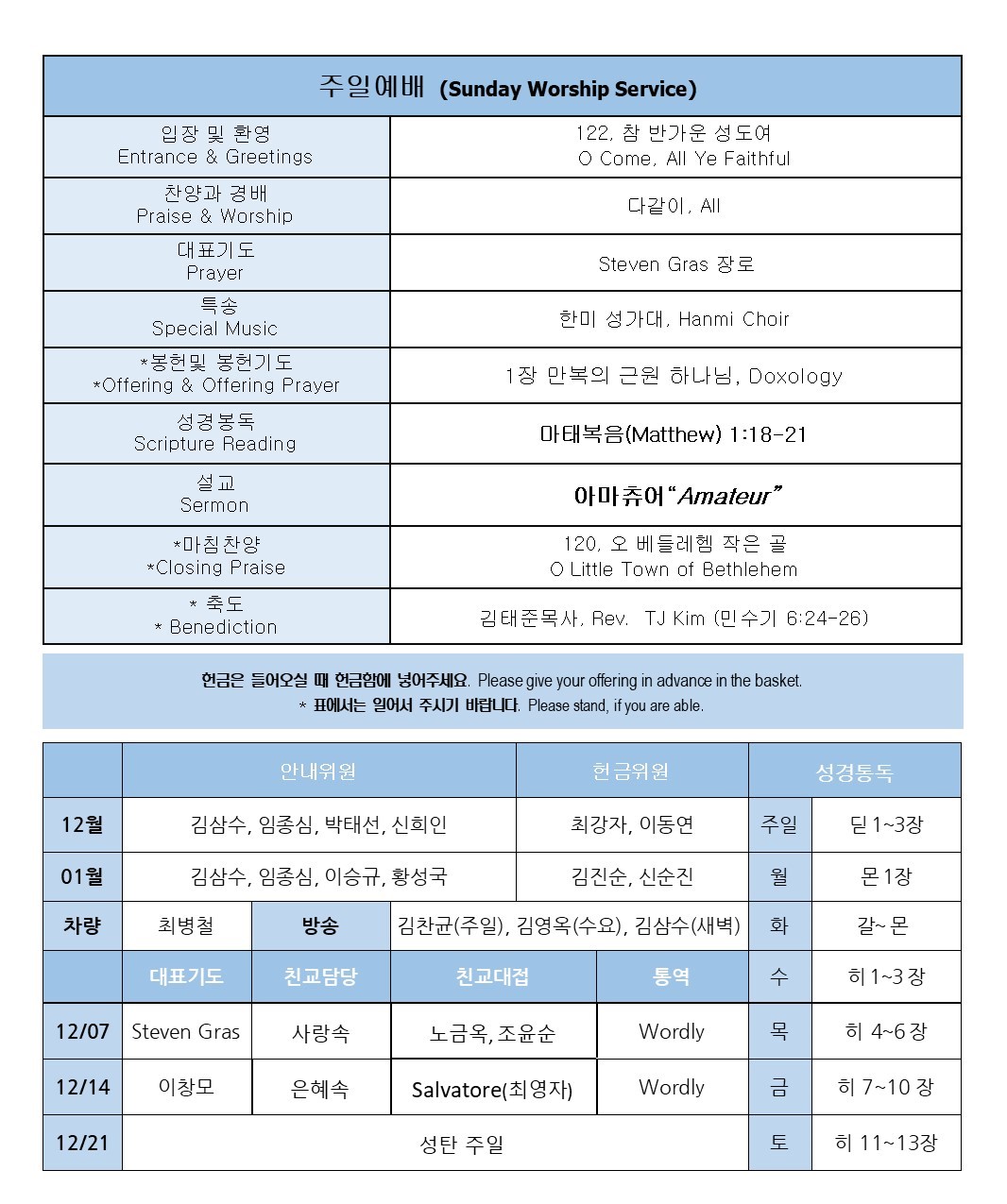 * 성탄주일 연합예배가 12월 21일 주일 오전 11시에 있습니다. 온 가족이 함께 예배 드리시기 바랍니다.