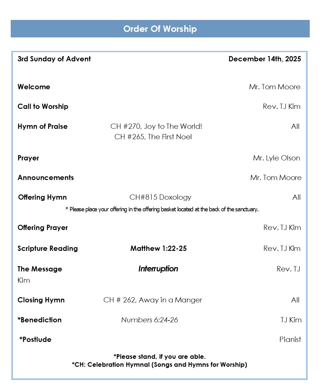 12/14/2025 - [EM] Announcement 페이지 정보 작성자 한미감리교회 조회 28회 작성일 25-12-13 16:04 목록 본문 Enlarge * Today is the Third Sunday of Advent. As we worship together, we pray that God’s grace will fill our hearts and that we may truly experience the joy of His Kingdom. * We warmly welcome everyone who joined us for this blessed Sunday worship service in the name of our Lord. We are so glad you are here today. * Bagels and coffee are available in the Fellowship hall downstairs after the service. * Sunday School Class will meet after the service in the Young Adults’ Room. Topic for the day is “Why the Virgin Birth Matter?’ Please join us with coffee and bagel. * Monthly Bible Study meets at 8:00 am, every second Saturday of month. Next month we are studying the Chapter 5, First Letter of Peter, on January 10, led by Elder Mr. Steven Gras. Everyone is invited. * We extend our heartfelt thanks to all the cell group members who so joyfully participated in last Sunday’s Inter –Cell Group Talent Festival. Once again, congratulations to the Gratitude Cell and the Joy Cell for sharing first place! * The Glory Choir held its year-end party at church this past Friday. We are grateful to Exhorter Taesun Park and everyone who lovingly prepared the food and made the evening so special. * Orders for poinsettias in celebration of Christmas Sunday will be accepted through today. * Please remember to submit the Advent Special Offering for the Homeless Ministry by today. This month's Homeless Ministry will take place this coming Saturday, the 20th. * Our Christmas Sunday Joint Worship Service will take place on Sunday, December 21, at 11:00 a.m. The entire KAMC family will gather as one body to joyfully worship Jesus Christ, who came to dwell among us. Following the service, a Christmas dinner prepared by the Women’s Mission Society will be served. * The Christmas Celebration Concert will be held on Wednesday, December 24, at 7:00 p.m. A beautiful and joyful evening of praise has been prepared, and we warmly encourage everyone to attend and fully share in the joy of Christmas. * The general meetings for each Women’s Mission Society will be held today after the 11 am service. * Youth Group events: Ski Trip (12/22), Family Game Night (12/26). Please contact Pastor Daniel for more information * 2026 Church Calendars are available. Please pick 2 wall-hanging calendars and 1 desk one for each family. Thank you. 댓글 0 댓글목록 등록된 댓글이 없습니다. 목록