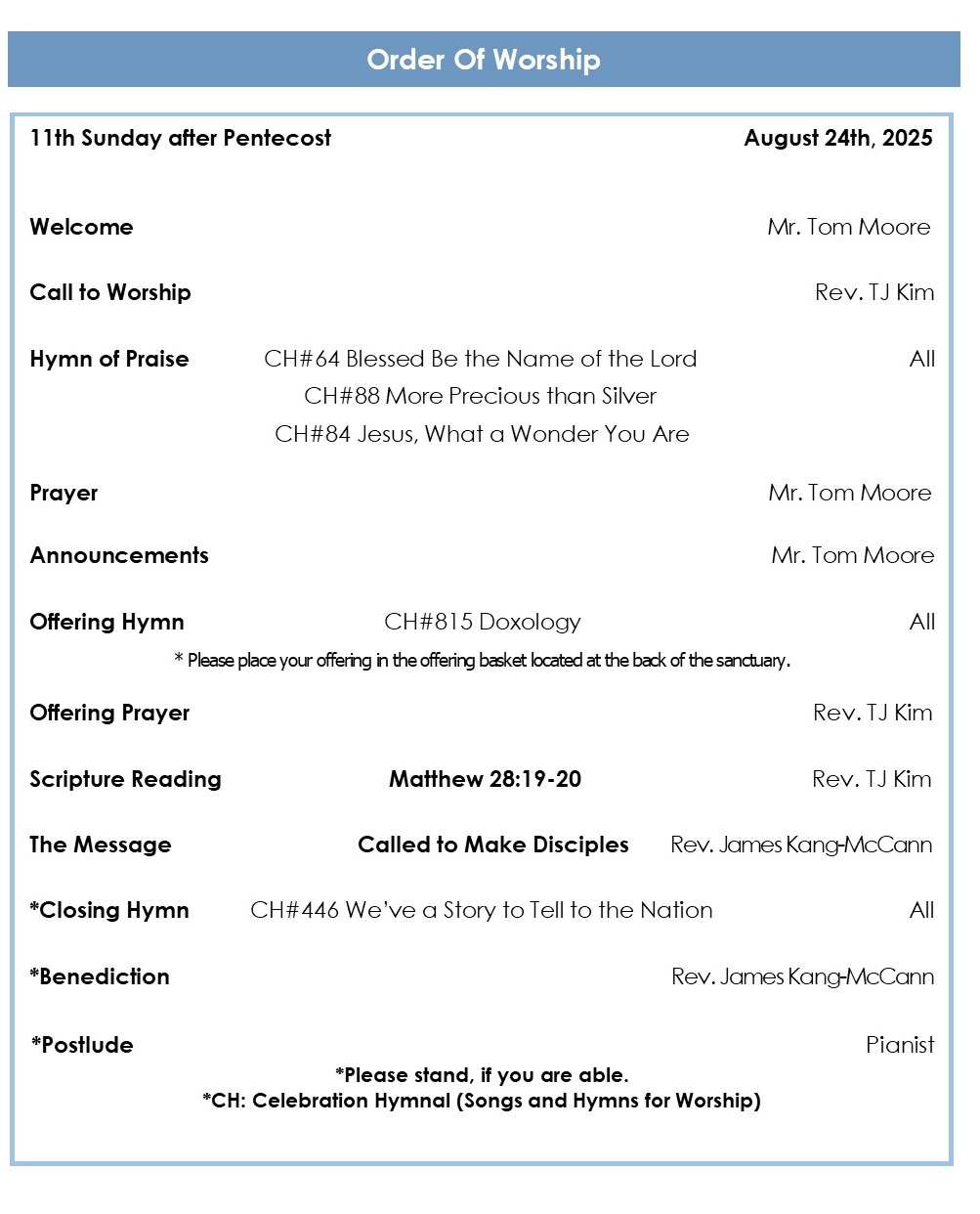 * The Peru Vision Trip Team (21 members) will depart from Denver Airport on August 28 at 10:00 AM and return on September 5 at 2:00 PM. During the trip, they will visit the mission field of Missionary Hong Jong Ae in Peru, participating in local ministry through street evangelism, testimonies, and more, while learning and experiencing Peru missions. Please continue to pray for a safe journey and for an abundance of God’s grace throughout the trip.