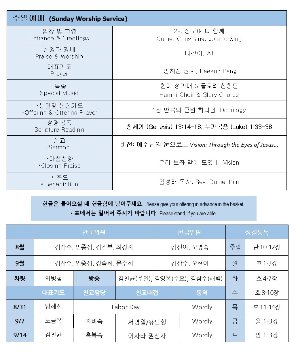 * 오늘 귀한 주일 예배에 참석하신 여러분을 주의 이름으로 환영합니다! * Labor Day를 맞아 오늘 친교는 없습니다. 가정별, 또는 속별로 좋은 시간을 가지시기 바랍니다.