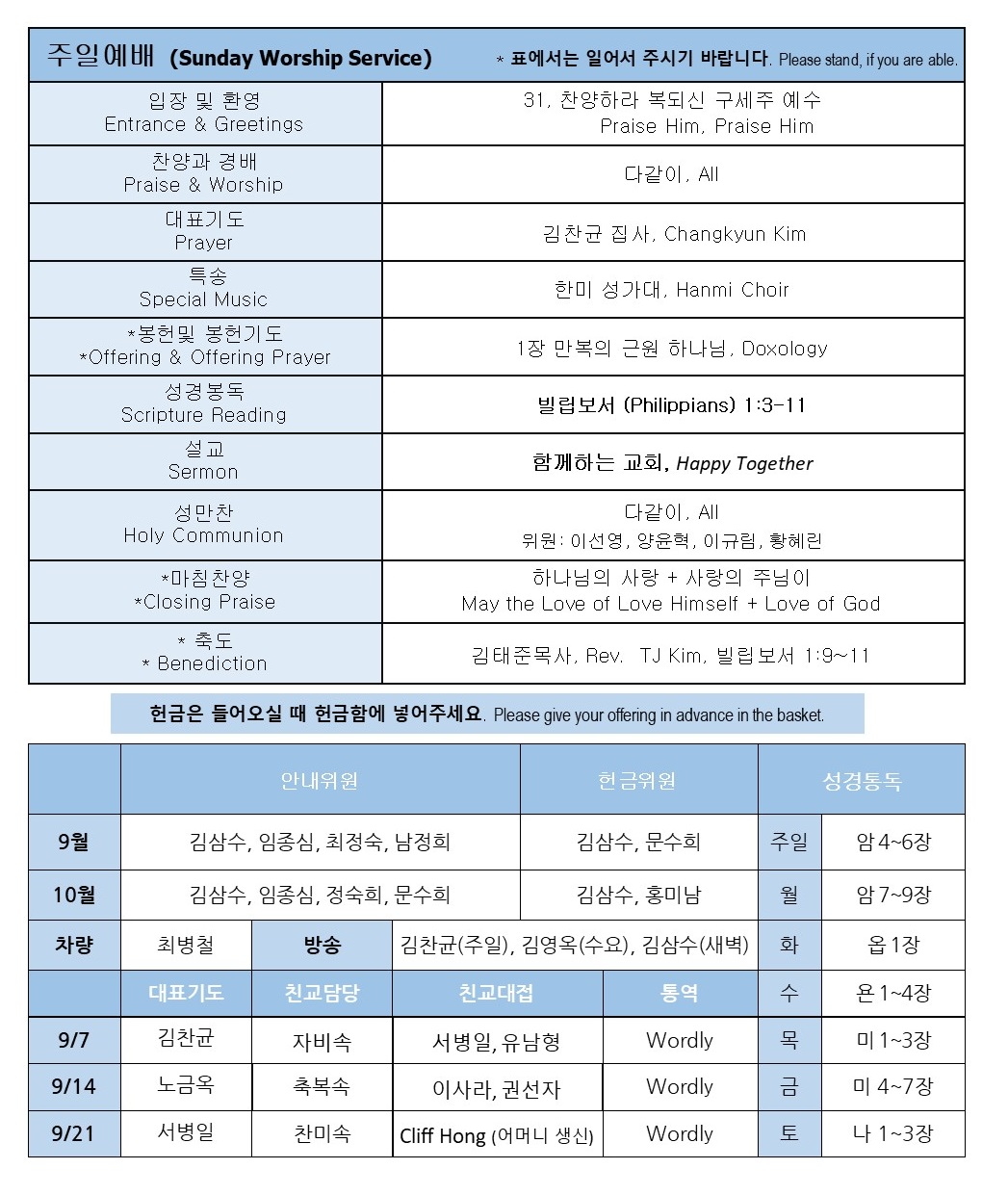 * 21일 주일 집회에서는 한미교회 성가대와 찬양팀이 수고해 주십니다.