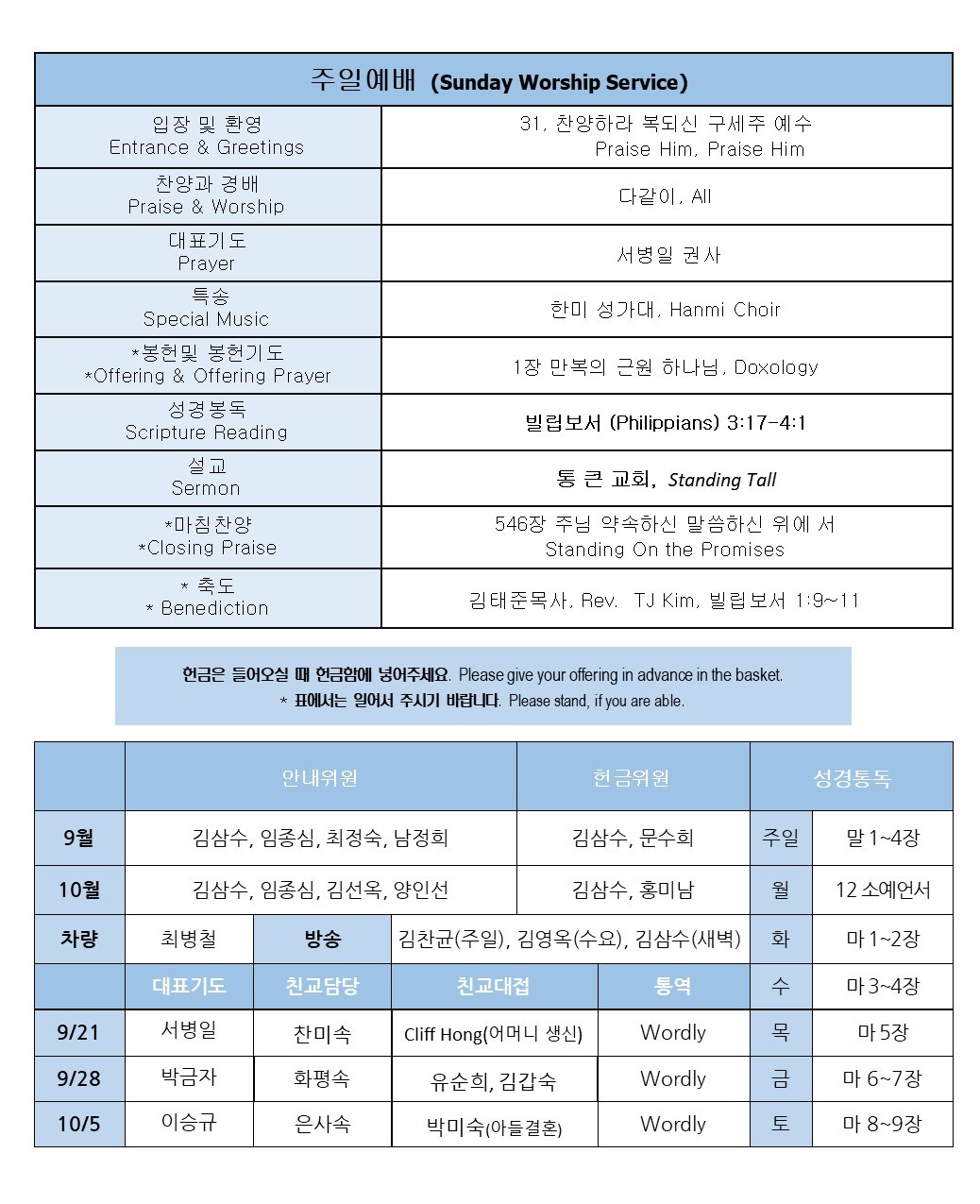 10/5(주일) 이빌립 목사 (통일소망선교회) 초청 선교보고, 인선위원회 (1pm)