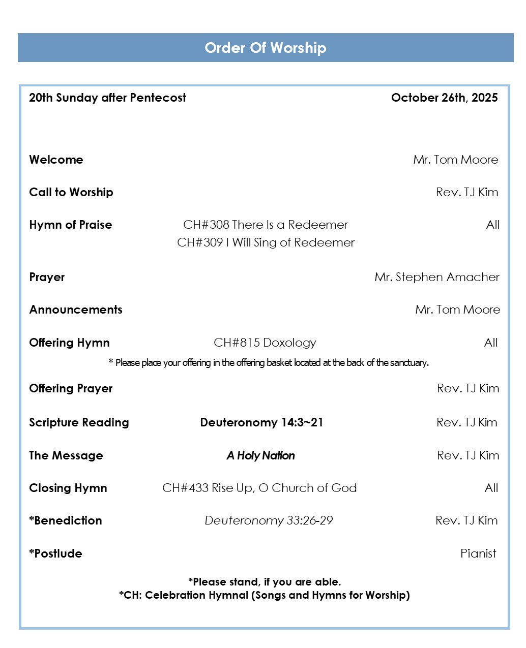10/26/2025 - [EM] Announcemenet 페이지 정보 작성자 한미감리교회 조회 249회 작성일 25-10-25 12:40 목록 본문 크게보기 * Welcome! We are so glad that you are here to worship with us today! May this time of worship be an awesome opportunity to experience God’s abundant grace! * Bagels and coffee will not be available today and next Sunday due to ongoing construction. * Sunday School Class on “the 24 Articles of Religion” is being held in the Young Adults’ room, right after our Sunday Service. Please come down and join us! * Monthly Bible Study meets at 8:00 am, every second Saturday of month at church. We will be studying the Book of 1 Peter, Chapter 3, on November 8, led by Mr. Tom Moore. Everyone is invited. * Daylight Saving Time ends next Sunday. Don’t forget to set your clock back one hour, from 2 a.m. to 1 a.m. that morning. * The Small Group Talent Festival will be held on Sunday, November 16, following the 11 AM worship service. Each small group is asked to prepare a program of no more than 10 minutes to offer a praise of thanksgiving using the talents God has given. In addition to a grand prize (with a cash award), there will be various other prizes such as Participation Award, Effort Award, Most Touching Performance Award, and Cutest Performance Award. Let’s come together in unity to make this a joyful and abundant celebration of thanksgiving. * Construction in the fellowship hall will take place until November 7. * Due to the basement construction, today’s SEED Children’s Chapel and Imago Dei Youth Chapel will join the main worship service. After the children/youth sermon, each group will have a special event. The Children’s Ministry will go to the Pumpkin Patch (Longneck Pumpkin Farm, 7595 California Dr), and the Youth Group will go roller skating (Skate City Austin Bluffs, 4575 Austin Bluffs Pkwy). * Committee Meetings in preparation for the Annual Church Conference are scheduled as follows. All committee members are asked to attend: Board of Trustees (today), Finance Committee (11/2), Church Council (11/9), Annual Church Conference (11/30). 댓글 0 댓글목록 등록된 댓글이 없습니다. 목록
