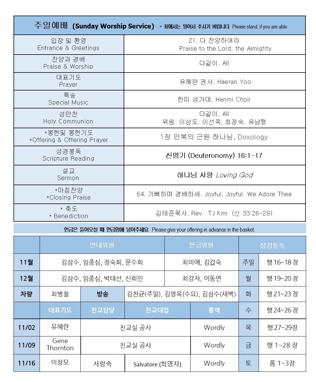 * 교인총회를 위한 위원회 모임이 다음과 같이 있습니다. 각 위원회 위원들께서 꼭 참여해 주시기 바랍니다. 재정 위원회(11/2), 임원회(11/9), 교인총회(11/30)
