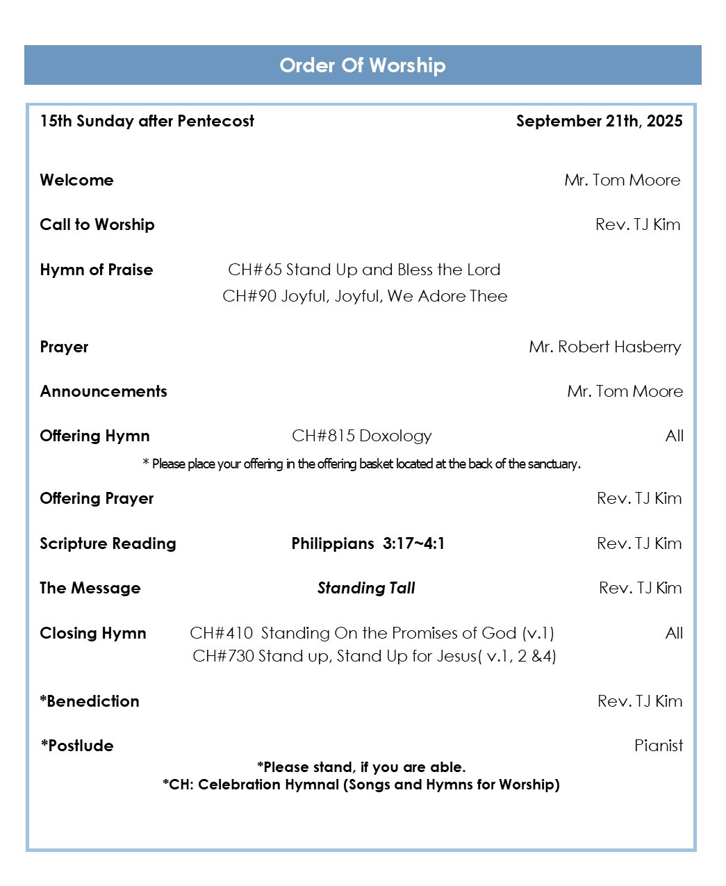* Rev. Daniel Kim will be on vacation for one week starting tomorrow through Monday, the 29th.