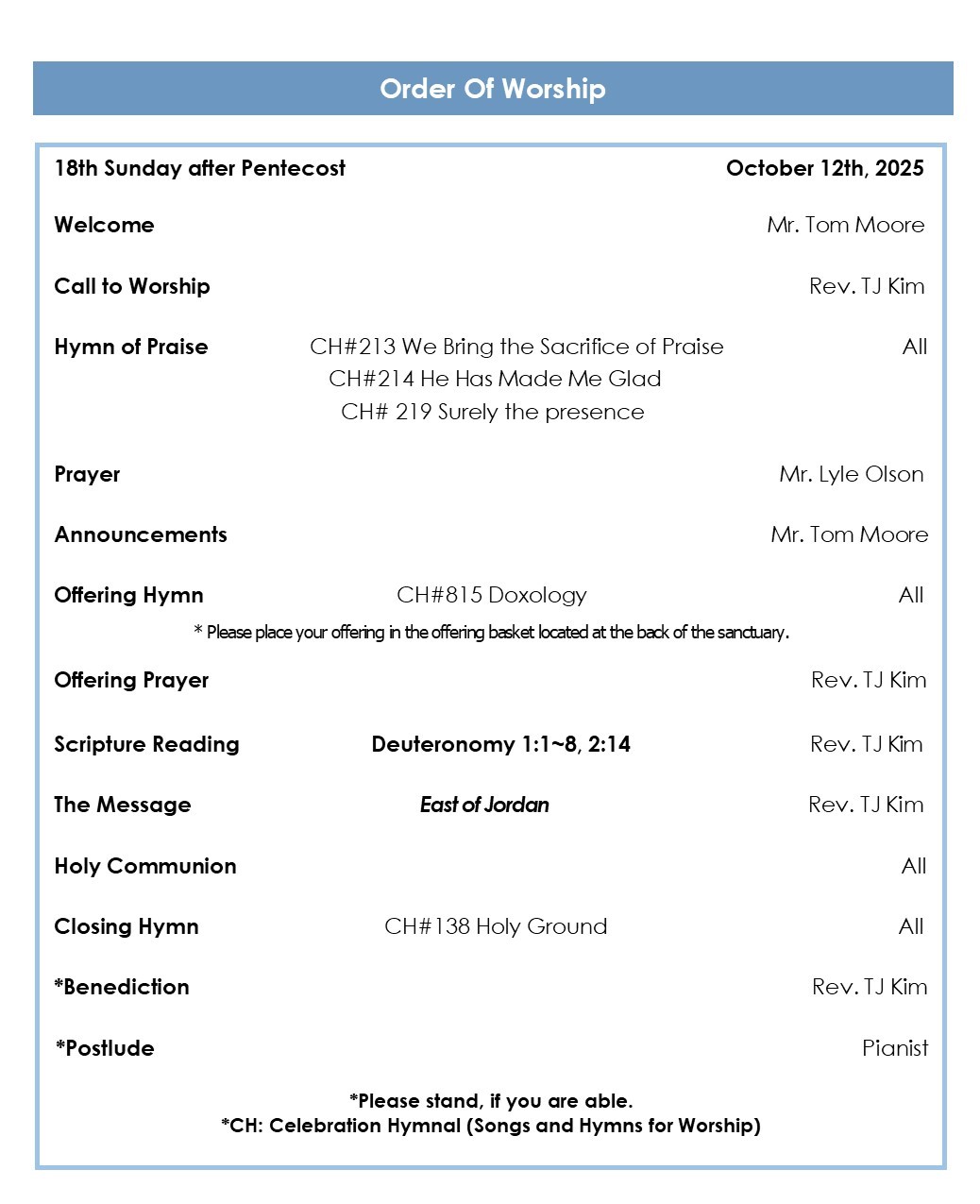 10/12/2025 - [EM] Announcements 페이지 정보 작성자 한미감리교회 조회 69회 작성일 25-10-11 14:34 목록 본문 Enlarge * Welcome! We are so glad that you are here to worship with us today! May this time of worship be an awesome opportunity to experience God’s abundant grace! Today we’re celebrating Holy communion. * Coffee & Bagel Fellowship! Bagel and coffee are available in the Fellowship Hall downstairs. Please come down and join us! * Today, there will be no Sunday School Class. * Monthly Bible Study meets at 8:00 am, every second Saturday of month at church. We will be studying the Book of 1 Peter Chapter 3 on November 8, led by Mr. Tom Moore. Everyone is invited. * The Newcomers’ Welcome Reception will be held on today. The newcomers’ class will begin at 1:00 PM, followed by the welcome fellowship at 2:00 PM. * Thanksgiving Story Campaign: Throughout the month of October, we are collecting your stories of thanksgiving along with a photo. Please submit your story via KakaoTalk or directly to the pastor’s office by October 26. Twenty selected stories will receive a prize and will be shared on the church website during November. * The Small Group Talent Festival will be held on Sunday, November 16, following the 11 AM worship service. Each small group is asked to prepare a program of no more than 5 minutes to offer a praise of thanksgiving using the talents God has given. In addition to a grand prize (with a cash award), there will be various other prizes such as Participation Award, Effort Award, Most Touching Performance Award, and Cutest Performance Award. Let’s come together in unity to make this a joyful and abundant celebration of thanksgiving. * Construction in the fellowship hall will take place for 2 weeks from Oct. 20. * The Homeless mission is scheduled for this coming Saturday, Oct 18th. We’ll be leaving from the church at 10:30 AM. * Committee Meetings in preparation for the Annual Church Conference are scheduled as follows. All committee members are asked to attend: Nominations Committee (10/05), SPRC (10/19), Board of Trustees (10/26), Finance Committee (11/2), Church Council (11/9), Annual Church Conference (11/30). 댓글 0 댓글목록 등록된 댓글이 없습니다. 목록