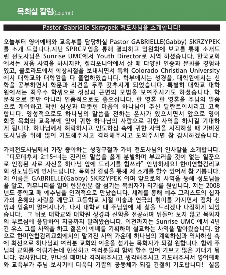 Pastor Gabby Skrzypek 전도사님을 소개합니다!