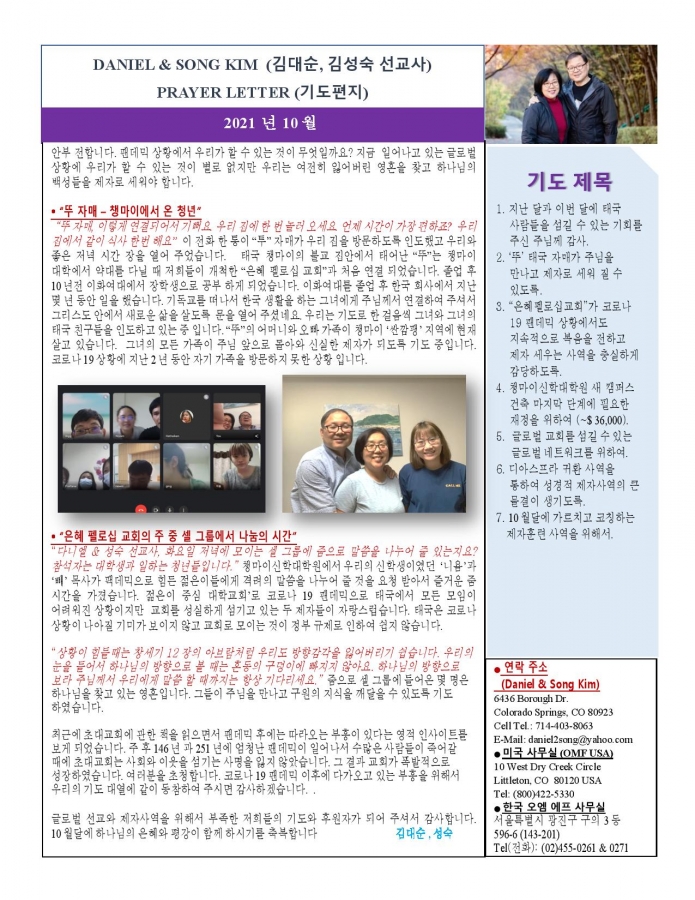 2021 태국에서 온 선교편지 10월 페이지 정보 작성자 한미연합감리교회 조회 1,360회 작성일 21-10-06 10:53 목록 본문 2021 태국에서 온 선교편지 10월 이전글2021 11월 태국에서 온 선교편지 21.11.19 다음글2021 태국에서 온 선교편지 9월 21.09.04 댓글 0 댓글목록 등록된 댓글이 없습니다. 목록