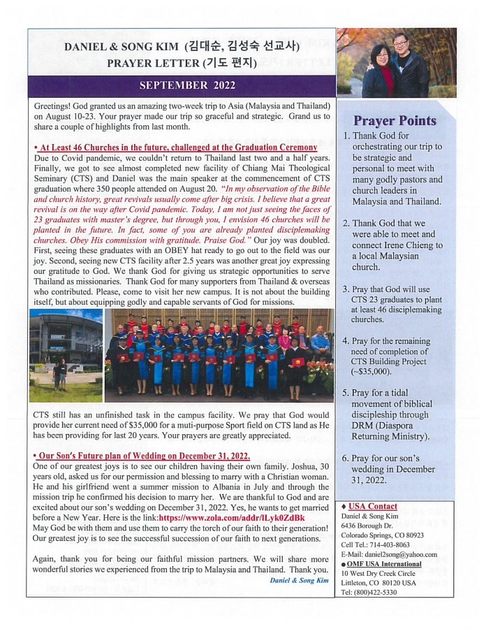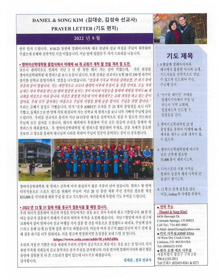 2022년 9월 말레이시아와 태국에서 온 선교 편지