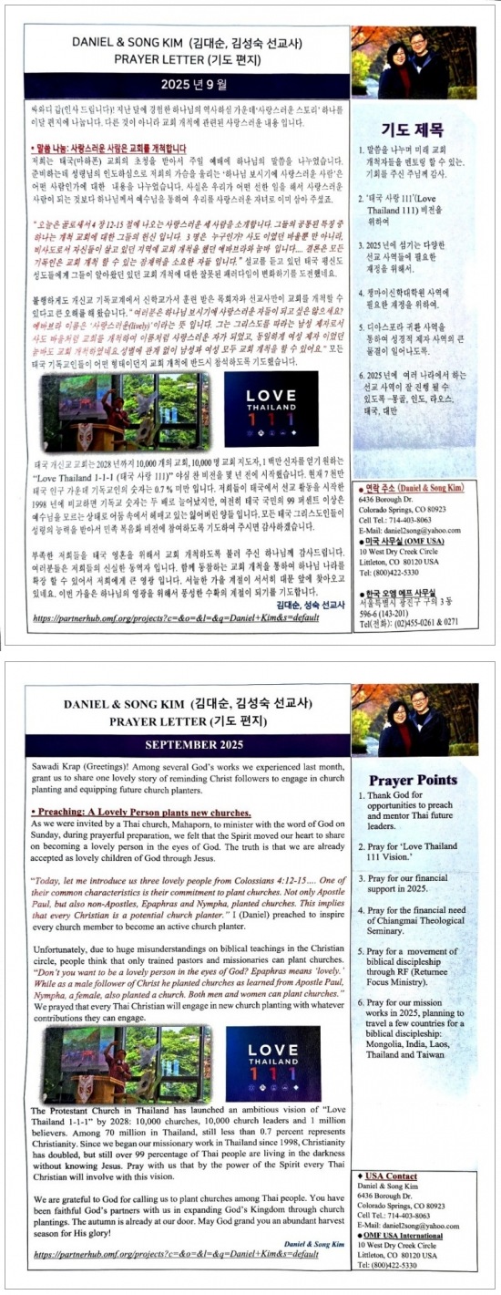 태국 (Thailand) - 김대순, 김성숙 선교사님 9월 선교편지 - 9/23/25
